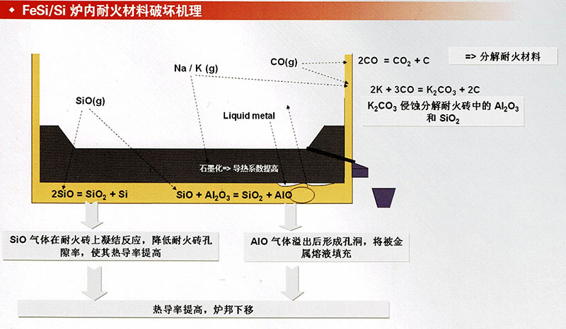 因?yàn)樵贔eSi、Si及電石和生產(chǎn)所用的材料中都含有一定量的堿,生產(chǎn)過(guò)程中堿會(huì)降低,同時(shí)會(huì)形成一定壓力的堿性氣體,堿性氣體向下滲透到炭質(zhì)爐襯會(huì)使炭質(zhì)爐襯石墨化,由于炭質(zhì)爐襯在石墨化會(huì)急劇的使其導(dǎo)熱系數(shù)增加。因而造成炭質(zhì)爐襯材料下面的材料完全暴露在1700-1800℃的高溫下,這遠(yuǎn)遠(yuǎn)高于常規(guī)耐火材料最大工作溫度。從反映坩堝滲透下來(lái)的CO氣體在這種溫度下將和耐火材料當(dāng)中的AI2O3發(fā)生還原反應(yīng)形成AIO,AIO氣體將上升逐漸的耐火材料這里會(huì)形成空洞。然而SiC糊料將不會(huì)受來(lái)自于反應(yīng)區(qū)氣體的侵蝕,所以也不會(huì)被破壞或形成空洞。